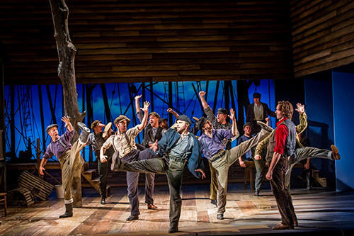 Michael Rouse as Jigger (centre) and Michael Todd Simpson as Billy Bigelow (right) with the Chorus of Opera North and dancers. Photo credit: Robert Workman