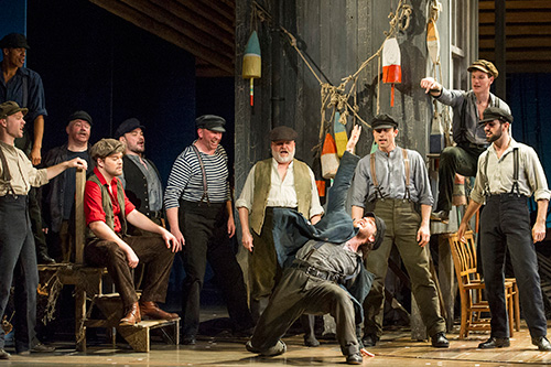 Keith Higham as Billy Bigelow (red shirt) and Stuart Neal as Jigger Craigin (centre) with the chorus and dancers