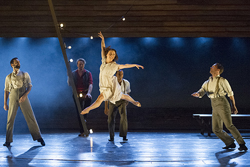 Keith Higham as Billy Bigelow (red shirt) and Alex Newton as Louise (centre) with dancers